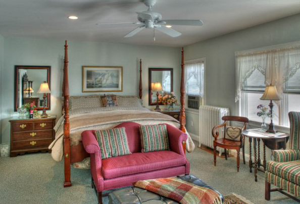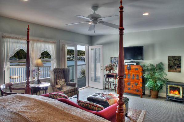Imagine a 22'x16' room with a grand rosewood KING poster bed, between two mahogany mirrored bureaus, walls decked in sea green and adorned with nautical paintings, and you'll see why we call this room Admiral's Rest. At the foot of the bed is a cozy sitting area with a silk Persian rug, accompanied by a comfy love seat, wing chair, side tables, an electric Franklin fireplace, and a 37" flat TV. The antique art nouveau sideboard is from England, a large elm wood chest from Asia, and views of the harbor. Quiet mini-split conditioner, and heat, plus a ceiling fan, will keep the temperature just right.