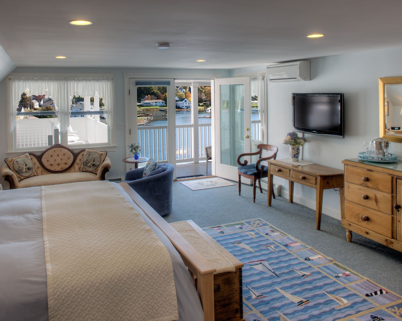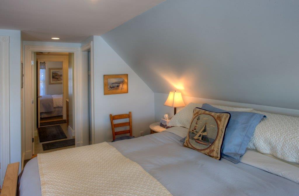 This spacious two room suite on the Third Floor is perfect for the couple looking water views, plus the extra space of two bedrooms. It is also ideal for three people traveling together. The large waterfront room has a KING bed, a sitting area with flat 37" TV, electric franklin firplace. A glass panel door, leads to the extended semi-private covered porch with wicker furniture overlooking the scenic harbor. Self controlled mini-split air conditioning and heat are provided for your comfort.